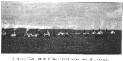 SUMMER CAMP OF THE BLACKFEET NEAR THE MOUNTAINS.