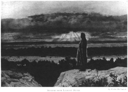 When the moon was high, I fell asleep. It seemed but a brief interval, until I was aroused, before daybreak, by Menake and Nitana preparing our morning meal. I rolled from my warm blankets into the chill air, with a "tired feeling." I was soon refreshed by a cold bath in the river and by the fresh air of the woods in the early dawn. Taking my lariat, I hurried past the silent white lodges of the North Piegans to the hills, where our horses were feeding. Passing from the shadows of the big trees to the open prairie, I was met by a gentle breeze, coming from the mountains, fragrant with the sweet odour of wild flowers and growing grass. I climbed Lookout Butte and, from its summit, saw the shadowy forms of our horses in a meadow nearby. On the eastern horizon I beheld the two magnificent planets, Venus and Jupiter, now in conjunction. Jupiter had risen first, and I realised that he was Poïa (Scarface), and that the other planet was his father, Morning Star.