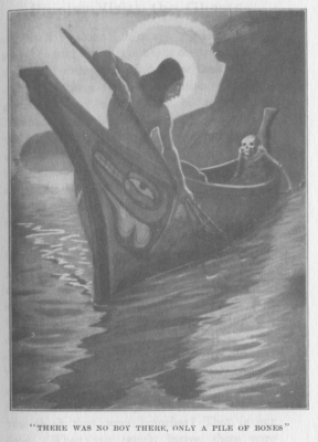 bones were in the canoe. He did this several times, but at last they reached the fishing-place, and began to fish with the dip-net. Now Blue-jay took into the canoe all the branches that he caught, and all the leaves, and when the tide began to fall their canoe was full, and they started homeward. Now he began to tease the ghosts, and when they met one he shouted, and only bones were in the canoe. At last they reached home, and he carried up to his sister's house part of what he had caught. She also carried up a partsalmon of two kinds.