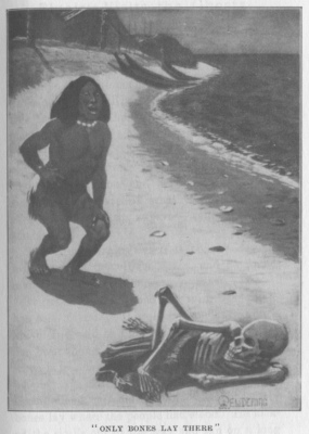 It got dark, and some one said, "A whale has been found." His elder sister gave him a knife, and said to him, "Quick, run! a whale has been found." Then Bluejay ran fast, and when he reached the beach he met some of those people. He called out to them in a loud voice, asking them, "Where is this whale?" Only bones lay where the people had stood. He kicked the skulls out of the way and ran on a long distance, and met some other people. Again