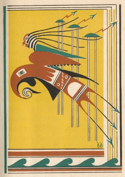 [paragraph continues] Everywhere was rolling water, leaping waves, crying winds. High above the earth the Storm God rode his thunder bird and shouted with joy while the wind blew his long hair loose through the flying clouds.