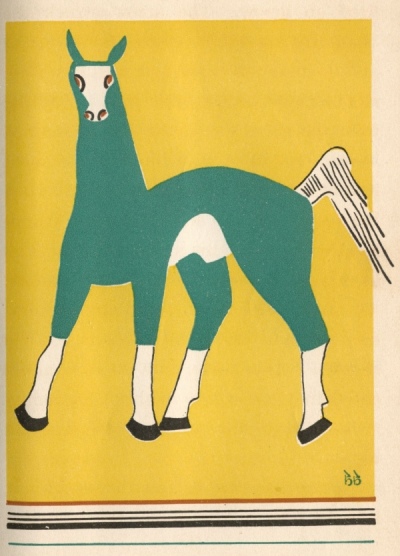 [paragraph continues] Indians of the country around never tried to catch him, but let him roam as he willed. To them this wild, free animal was a visitor from another land, from Spain, from a country which had sent powerful men in steel armor to them. Only one of the Indians had dared to ride the blue horse and he was the bravest of them all. When he died the Indians set the horse free, for there was fire in his eye and lightning in his hoofs.