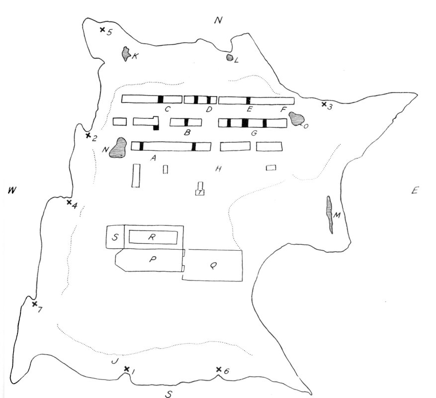 1, Rainbow (Kastiatsi) trail, by which the people first entered Acoma. 2, Ladder trail. 3, Cliff trail (very steep). 4, Sand trail. 5, Crack trail (not used always). 6, Ladder crack trail. 7, Burro trail. Black line, high cliff; dotted line, edge of mesa, second cliff (low). A-H, Places where katsina dance. J, Place where dancers dress. K, L, M. Cisterns for drinking water. N, O, Cisterns for washing, plastering, etc. Houses have rock foundation and the first floor is of rock. From there up. adobe. P, Church. Q, Cemetery. R, Convento. S, Corral where burros were kept. T, Komaxira meeting house built by Spaniards.
