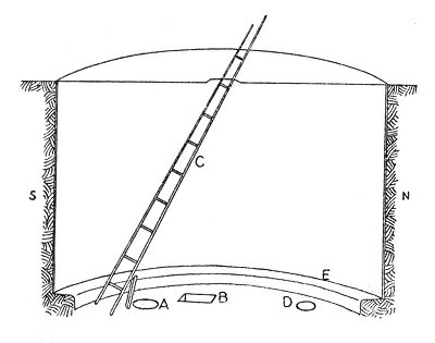 [paragraph continues] (fig. 2, A). In front of the fireplace is tsiwaimitiima (another-altar-placed-under). It is a hollow place in the floor in which an altar like the one Iatiku first made is kept. It is covered with a board (fig. 2, B). The chianyi are the only ones who are allowed to dance on it. It gives out a hollow sound. 52 Iatiku said that whenever a medicine man wanted to get more superhuman power for himself he was to dance and roll over this altar.