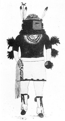 FIGURE 1. Kuapichani katsina. Wearing full katsina costume; eagle feathers (white with black tips), stick (black) with humming bird (red); parrot-feather topknot (red and green); ears (brown) painted as usual the color of the forehead (brown); spruce collar (green); turquoise earrings; abalone-shell pendant; coral necklaces (red); black torso and white lower body represent night and day; arm bands of buckskin with spruce (green); green buckskin belt; kashpa (black and white), ceremonial sash with tassels; hotsini (white with black border), cotton kilt; in right hand gourd rattle (quartered in orange, red, green, blue); in left hand flute (striped red and white with zigzag design in green, black, and white) with gourd (center, orange with cross; edge, white with green design) on the end; garters (blue) with turtle-shell rattle (brown); moccasins of buckskin (white with red toes).
