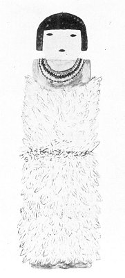 FIGURE 2. Hachamoni kaiok (broken prayer stick). The face (yellow, hair black with white feather on top) represents Iatiku; the feathers are eagle down, and under them is cotton; body brown; first necklace, shells; second, coral; third, coral beads with three abalone-shell pendants.