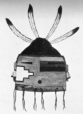 FIGURE 1. Nawish katsina. Eagle feathers (white with black tips); parrot-feather topknot (green and red); forehead brown edged with blue yarn; face painted with colors of the directions: orange (background of face), the earth, yellow (stripe at upper right), the Sun; green (center stripe at right), water; blue (lower stripe at right), the sky. The terraced design (white edged with red) represents a field; red yam around mouth; lower edge of mask with thongs for fastening, brown. A spruce collar will be worn.