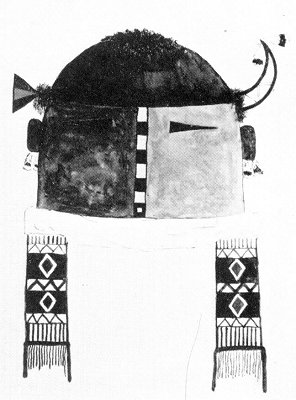 FIGURE 1. Chakoya katsina. Mask black bordered with brown; eye-slits yellow; blue feathers from duck head around the mouth; teeth of corn husks; beard of human hair. A skirt of an entire buckskin hanging almost to the feet will be worn.