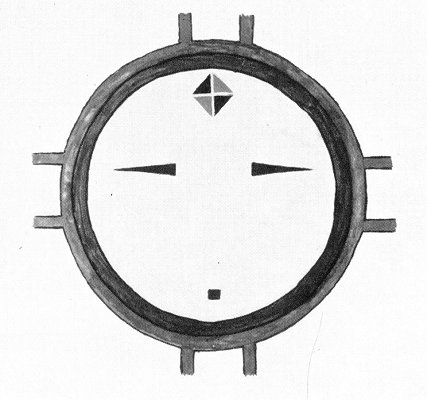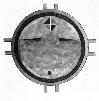 FIGURE 2. The Moon. The face is yellow because the Moon is female, and the light is pale; the two outer rims (green and red) are the "ring about the moon"; ornament (brown and black triangles, divided by white line) represents a squash blossom.