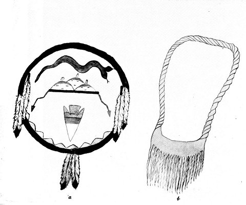 FIGURE 2. Shield and pouch of the Twins. a, Shield of buffalo hide; the two-headed water snake (brown) that the Twins killed at the time of the flood; stone point (tip white, butt yellow, with 2 lines, blue and red above) that Lightning (red) tried to kill them with, the colors representing the different kinds of stone points that were used; bottom, water waves (blue); eagle feathers. b, Pouch (light tan).