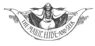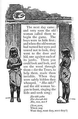 The next day came; and very soon the old woman called them to begin the game. The boys were to hide first; and when the old woman had turned her eyes and vowed not to look, they went to the door and hid, one against each of its jambs. There you could look and look, and see the wood through them--for the Trues, to help them, made them invisible. When they were safely hidden they whooped, "Hee-táh!" and the old woman began to hunt, singing the hide-and-seek song:
