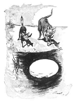 Running on the trail, he came to the lake; and there the Little-Blue-Fox was lying on the bank, whining as if greatly excited. "Now I will eat you up, this minute!" cried the Coyote. But the other said: "No, Friend Too-wháy-deh! Don't eat me up! I am waiting for some one who can swim as well as you can. I just bought a big cheese 1 from a shepherd to share with you; but when I went to drink, it slipped out of my hands into the water. [paragraph continues]