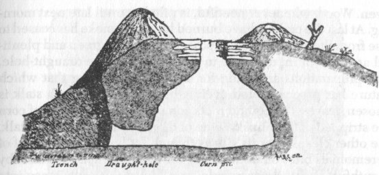 Autumn comes and the "corn children" have been taken in to meet their "Father and Mother," the yä'-po-to and the mi'-k?iap-pan-ne. A while later, another search is made through the field, this time for such corn as gives no promise of ripening. Blanketful after blanketful is picked, husks and all, and carried to some distant wooded hill where the soil is solid. Here, with sharp sticks, and hoes, a hole is dug resembling a well (see fig. 5). At the top, it is cut larger around, to the depth of a foot or more and walled up neatly and solidly with sandstone. Below this wall, say a foot, the hole is gradually enlarged toward the bottom, until it embraces a room several feet in diameter and cone-shaped, the apex as it were, being the walled, circular opening. From the windward side of the hill, a trench is dug to a level with the bottom of the excavation. A hole or passage, about two feet in diameter is cut from the end of the trench to the interior. Dry grass, old leaves, pitchy sticks, are thrown in from above, and arranged by a man who has entered through the trench. On top of these wood is piled until the hole is full. The mass is now fired. As soon as the night-wind rises, flames dart upward through the circular hole, many feet into the air, straight, lurid, setting the woodlands around and the skies above, fairly aglow with ruddy splendor. All night long, a merry group of young people dance, sing and romp around this volcano-like oven. Wood, whenever needful, is piled in until late next morning. At last the embers have burned low, and smoke has ceased to rise from their glaring red depths. Corn-stalks, green and plentiful are thrown in, more are tucked into the large draught-hole, and preparations are made for artificially ripening that which nature has procrastinated over. A beautiful, long, fresh stalk is chosen, leaves, tassels and roots complete. Two fine ears of corn are stripped of their husks. One of them is laid against the stalk, the other cleansed of its silk as though for boiling. The chief of ceremonials bites off from this all the milky kernels mouthful by mouthful, chews them to pulp, and blows their substance into fine mist over the heaps of plucked corn. He then places the cob by the side of the other ear, and binds both firmly to the stalk. This, in the brief prayer he presently makes, is called the shi'-wa-ni or priest. It is cast into the still glowing pit, and then, men, women, young and old, begin to hurl in the unhusked corn from all sides until no more is left. Most likely space remains at the top. If so, it is quickly filled with green stalks, more of which are bundled up and used as a cork for the circular opening. A mound of damp soil is heaped to a considerable height above this impromptu stopper. As night again comes on, campfires, bright enough it is true, but pale compared with the flames of last night, are built at convenient distances. Muffled sounds come all night from the buried oven. Sometimes, though rarely, the top is blown off, but usually next morning the mound is found unchanged and the sounds have ceased.
