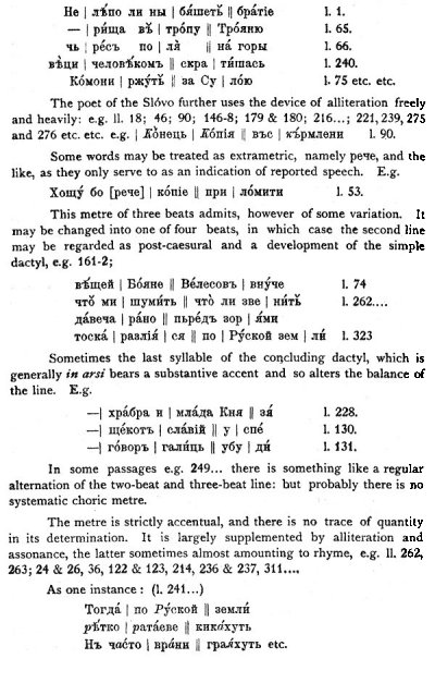 The regularity of the alliteration approximates the metre to that of the old German poems; but the freedom of the Slav has released this Russian verse from the stiffness and artificiality that characterize some of the Early English alliterative poems.