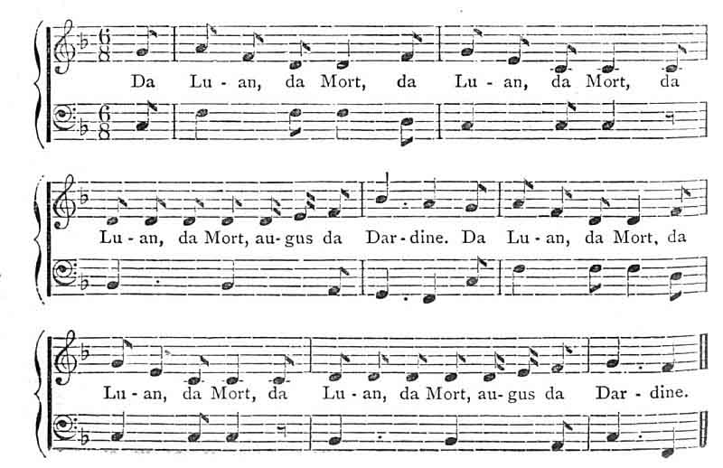Moat does not mean a place with water, but a tumulus or barrow. The words Da Luan Da Mort augus Da Dardeen are Gaelic for "Monday, Tuesday, and Wednesday too". Da Hena is Thursday. Story-tellers, in telling this tale, says Croker, sing these words to the following music-according to Croker, music of very ancient kind:--