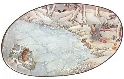 As the day broke he saw that the noise was caused by a large carp, which was persistently jumping out of the water, evidently trying to reach a piece of sembei (a kind of biscuit made of rice and salt) lying on the ice of a pond near which Rosetsu found himself. For full three hours the fish must have been jumping thus unsuccessfully, cutting and bruising himself against the edges of the ice until the blood flowed and many scales had been lost.