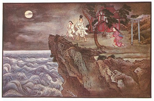 Tokoyo had slept about an hour when she heard, in spite of the dashing of waves against the rocks, a curious sound, the clapping of hands and the bitter sobbing of a girl. As she looked up in the bright moonlight she saw a beautiful person of fifteen years, sobbing bitterly. Beside her stood a man who seemed to be the shrine-keeper or priest. He was clapping his hands and mumbling 'Namu Amida Butsu's.' Both were dressed in white. When the prayer was over, the priest led the girl to the edge of the rocks, and was about to push her over into the sea, when O Tokoyo came to the rescue, rushing at and seizing the girl's arm just in time to save her. The old priest looked surprised at the intervention, but was in no way angered or put about, and explained as follows:--