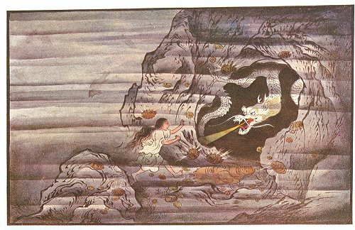 Slowly the monster came on, and Tokoyo braced herself for the combat. When the creature was within six feet of her, she moved sideways and struck out his right eye. This so disconcerted the evil god that he turned and tried to re-enter the cavern; but Tokoyo was too clever for him. Blinded by the loss of his right eye, as also by the blood which flooded into his left, the monster was slow in his movements, and thus the brave and agile Tokoyo was able to do with him much as she liked. She got to the left side of him, where she was able to stab him in the heart, and, knowing that he could not long survive the blow, she headed him off so as to prevent his gaining too far an entrance into the cave, where in the darkness she might find herself at a disadvantage. Yofuné-Nushi, however, was unable to see his way back to the depths of his cavern, and after two or three heavy gasps died, not far from the entrance.