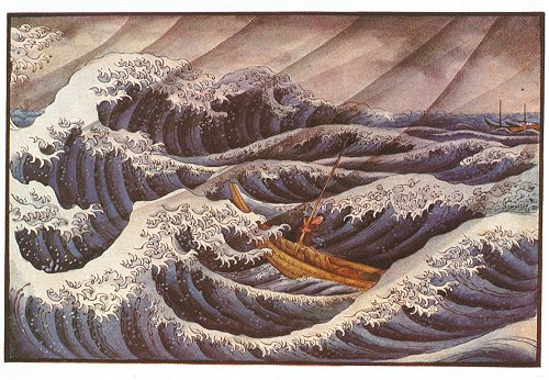 With that Makino Heinei shot out into the wild sea, and by extraordinary exertion managed to get some three hundred yards ahead of the rest of the fleet. Then the gale increased to such violence that he was incapable of doing anything. For fear of being blown out of the boat, he was obliged to hold tight to the mast and otherwise abandon his fate to good fortune. At times even the heart of the Wild Boar quailed. Often his boat was lifted clean out of the water by the wind; waves towered over him; he closed his eyes and awaited his fate.