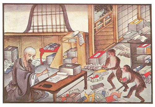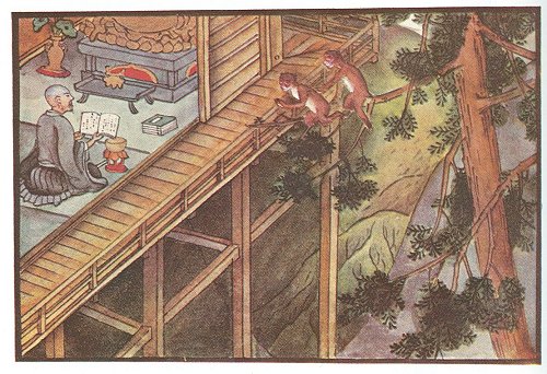 One day the good youth perceived that two monkeys had come down from the mountain and sat listening to his reading with serious faces and no tricks. He was amused, and, taking no notice, continued to read. As soon as he had finished, the monkeys went off into the hills.