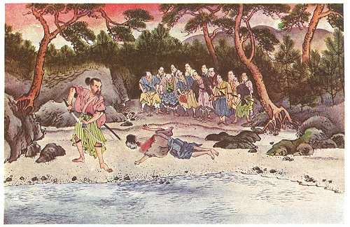 The poor samurai bowed to the ground, and the old couple, too simple to know what to do, remained silent, with tears of sorrow and of sympathy streaming down their faces.