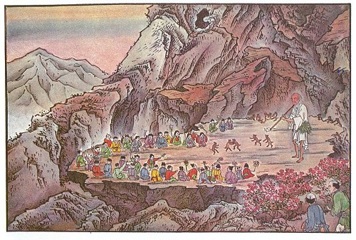 The two men came out from their hiding, and they, with the children, tried to follow him. In spite of his great age, he was much more nimble than they among the rocks; but they got far enough to see him enter the cave. Some minutes later they came to the entrance, and bowed before it. The entrance was surrounded by fragrant flowers; but into its dark depths they did not venture.