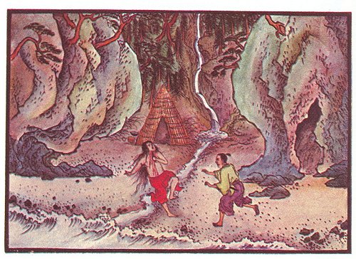 Strolling along the shore, he met a girl, tanned by sun and wind. She wore only a red cotton cloth about her loins, and her hair fell upon her shoulders. She had been gathering shell-fish, and had a basket of them under her arm. Sawara thought it strange that he should meet a single woman in so wild a place, and more so still when she addressed him, saying, 'Surely you are Sawara Kameju--are you not?'
