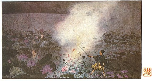 the lotus lily. Ippai was puzzled, and was almost inclined to sheathe his sword on seeing how innocent and unsuspecting the children looked; but he thought that he would not be acting up to the determination of a samurai if he changed his mind. Gripping his sword with renewed vigour, therefore, he dashed out from his hiding-place and slashed right and left among the supposed kappas.