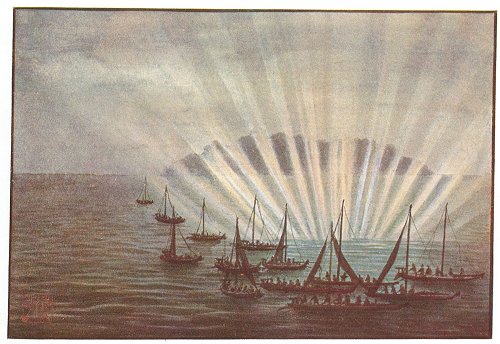 As the sea calmed down and the villagers were looking out, on the third day cause for astonishment came. Shooting out of the sea near the island rock were rays that seemed to come from a sun in the bottom of the sea. All the village congregated on the beach to see this extraordinary spectacle, which was discussed far into the night.