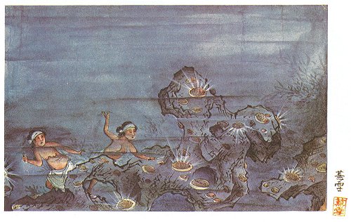 The priest and the elder fishermen considered matters, and came to the conclusion that what they had seen was indeed their goddess, and that she had been pleased at their ceremony. Also, they thought the dead body must still be at the bottom of the bay, directly under the spot whence the flashes of light and the goddess herself had appeared. It was arranged that two young virgins who could dive should be sent down at the spot to see, and two were accordingly chosen--Saotome and Tamajo. Wrapped in white skirts, these maidens were taken in a boat to where the flashes and the goddess had appeared. The girls dived, reached the bottom, and searched for the body of the man drowned two years before. Instead of finding it, they saw only a small but dazzling light. Curiosity led them to the spot, and there they found