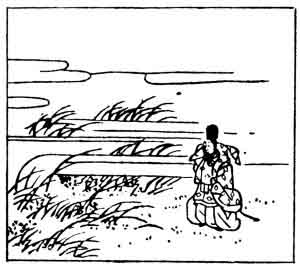 Asayasu, the son of the author of verse No. 22, lived about the end of the ninth century. He is said to have composed this verse at the request of the Emperor Daigo in the year 900. To liken the dewdrops to jewels or beads (tama) is typical of Japanese verse. The picture shows the grass, and the dewdrops scattered on the ground in front of the poet.