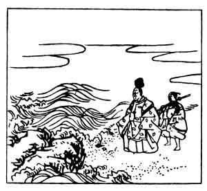 The writer of this verse is said to have died in the year 963; for a note about the great Minamoto family, see verse No. 28. In the picture we see Shige-yuki, with an attendant carrying his sword, walking on the shore, while the waves break into spray at his feet.