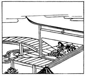 The real name of this lady was Taka, and her son's name was Korechika Fujiwara. She lived about A.D. 1004, and it is supposed that this verse was written in a fit of jealousy against her husband; she is shown in the picture all alone at home bewailing her lot.