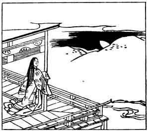This writer is again a lady; she is said to have addressed the verse to Michinaga Fujiwara, who held the office of Regent under the Emperor Ichijō (A.D. 987-1011) and his two successors. Regent here must be understood not exactly as a temporary or vice Emperor, but rather as the Emperor's confidential adviser, and the official through whom all communications were made. Notice the moon in the illustration just disappearing behind the hill.