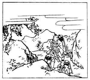 The Archbishop is said to have ended his life in the year 1135, by the method described in the note to verse No. 12. The scene of this poem was the sacred mountain Ōmine, in the Province of Yamato, famous for its cherry blossoms, and the illustration shows the Priest with his two attendants addressing the cherry tree.