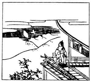 The writer's name was Sanesada Fujiwara, and he entered the priesthood in the year 1198. The cuckoo, according to Japanese tradition, cries through the night until its eyes become bloodshot. It is supposed to come from the Spirit-land across the mountains of Hades, about the end of the fifth month, to warn the farmer that it is time to sow his rice. In the illustration we see the morning moon setting behind the hills, and the cuckoo flying away.