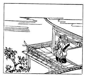 The picture does not seem to illustrate the verse very well; it is probably meant to show Kintsune on his verandah, lamenting over his increasing years; but in the original edition, from which the pictures were taken, fallen cherry blossoms are shown underneath the verse at the bottom of the page.