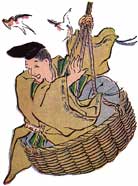 "Help, help!" he screamed. The men began to lower the basket. Just then he remembered the shell and thrust his hand into a nest. There was something hard there. He seized it, but lost his balance and came tumbling down. Instead of coming down in the basket he came down thump on the hot stove.