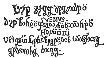 [paragraph continues] Thalamus veneris sepultæ.These I copied and set down in my table-book. After this door was opened, the Page lead me by the hand through a very dark passage till we came to a little door now only put too, for, as the Page informed me, it was first opened yesterday when the coffins were taken out, and had not since been shut. As soon as we stepped in I espied the most pretious thing that Nature ever created, for this vault had no other light but from certain huge carbuncles. Thesaurus Regis.This was the King's Treasury, but the most glorious and principal thing was a sepulchre in the middle, so rich that I wondered it was no better guarded, whereunto the Page answered me, that I had good reason to be thankful to my planet, by whose influence I had now seen certain pieces which no humane eye (except those of the King's family) Descriptio sepulchri.had ever viewed. This sepulcher was triangular, and had in the middle of it a kettle of polished copper, the rest was of pure gold and pretious stones. In the kettle stood an angel, who held in his arms an unknown tree, whose fruit continually falling into the kettle, turned into water therein, and ran out into three small golden kettles standing by. This little altar was supported by an eagle, an ox, and a lion, which stood on an exceeding costly base. I asked my Page what this might signifie. "Here," said he, "lies buried Lady Venus, that beauty which hath undone many a great man, both in fourtune, honour, blessing, and prosperity"; after which he showed me a copper door in Aliud triclinium.the pavement, saying, "Here, if you please, we may go further down." We descended the steps, where it was exceeding dark, but the Page immediately opened a little chest in which stood a small ever-burning taper, wherefrom he kindled one of the many torches that lay by. I was mightily terrified and asked how he durst do this. He