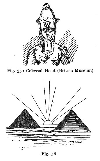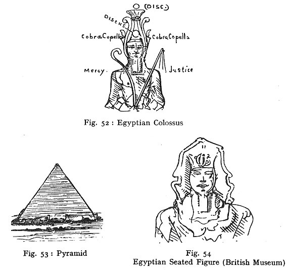 Fig. 52: Egyptian Colossus; Fig. 53: Pyramid; Fig. 54: Egyptian Seated Figure (British Museum)