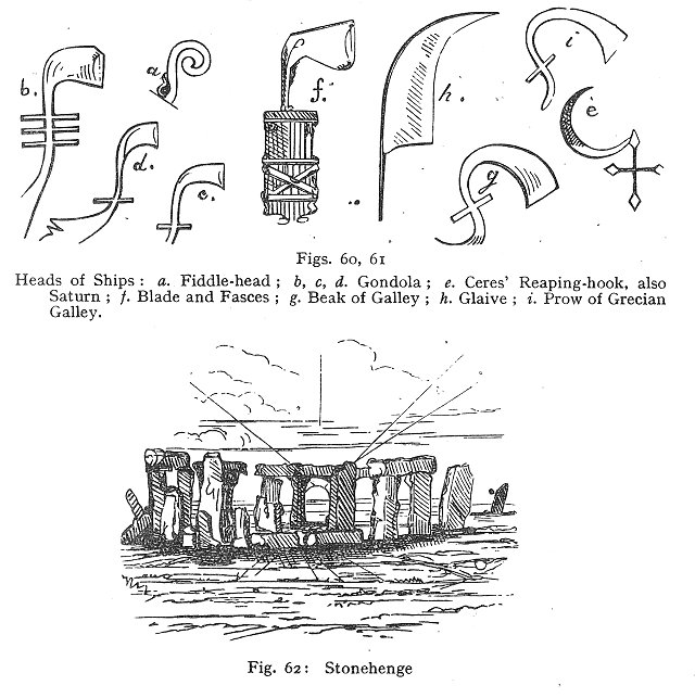 Figs. 60, 61: Heads of Ships: a. Fiddle-head; b, c, d. Gondola; e. Ceres’ Reaping-hook, also Saturn; f. Blade and Fasces; g. Beak of Galley; h. Glaive; i. Prow of Grecian Galley. Fig. 62: Stonehenge |
