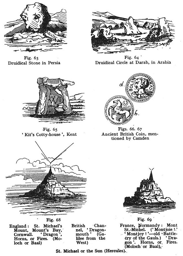 Fig. 63: Druidical Stone in Persia; Fig. 64: Druidical Circle at Darab, in Arabia Fig. 65: 'Kit's Cotty-house', Kent; Figs. 66. 67 Ancient British Coin, mentioned by Camden; Figs. 68 and 69: St. Michael or the Sun (Hercules) Fig. 68: England: St. Michael's Mount, Mount's Bay, Cornwall. 'Dragon', Horns, or Fires. (Moloch or Baal) British Channel, 'Dragon-mouth' (Galilee from the West) Fig. 69: France, Normandy: Mont St.-Michel. ('Montjoie!' 'Montjoy!'--old Battle-cry of the Gauls.) 'Dragon'. Horns, or Fires. (Moloch or Baal). |