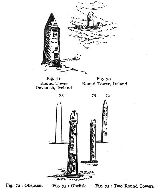 Fig. 71: Round Tower Devenish, Ireland; Fig. 70 Round Tower, Ireland; Fig. 72: Obeliscus; Fig. 73: Obelisk; Fig. 75: Two Round Towers. |