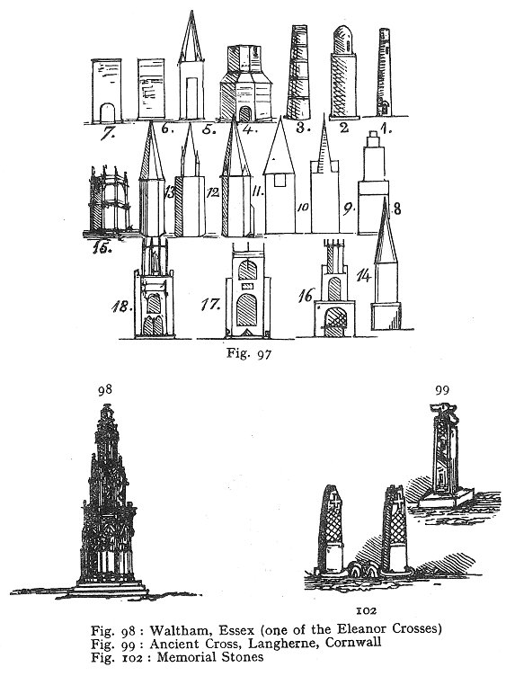 Fig. 98: Waltham, Essex (one of the Eleanor Crosses) Fig. 99: Ancient Cross, Langherne, Cornwall; Fig. 102: Memorial Stones. |