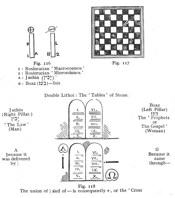 Fig. 118, on p. 250, represents the separated original 'Lithoi', when united. They then form the 'Double Tables' (or 'Table') of Stone. In the 'Latter'; or 'Christian (+) 'Dispensation', the 'Ten Commandments are over the Altar', composed of the 'Law' (Five Commandments to the Right); and the 'Gospel' (Five Commandments to the Left).