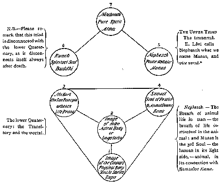 * Nephesch is the "breath of (animal) life" breathed into Adam, the man of dust; it is consequently the Vital Spark, the informing element. Without Manas, or what is miscalled in Levi's diagram Nephesch instead of Manas, "the reasoning Soul," or mind, Atma-Buddhi are irrational on this plane and cannot act. It is Buddhi which is the plastic mediator, not Manas, "the intelligent medium between the upper Triad and the lower Quaternary." But there are many such strange and curious transformations to be found in the Kabalistic works -- a convincing proof that its literature has become a sad jumble. We do not accept the classification except in this one particular, in order to show the points of agreement.